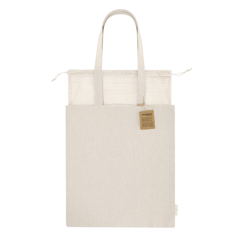 Bolsa fabricada principalmente en algodón reciclado de 260 g/m2 con sistema de cierre superior a cordones, fabricado en redecilla. Asas largas de 70cm con refuerzo, de acabado cosido. Logotipo en etiqueta lateral y resistencia hasta 8 kg de peso.