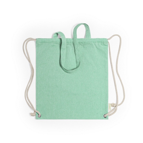 Bolsa Mochila Fenin color Verde. Codigo de impresión: F(6), N(8), O, P. Medida largo: 38 cm. Medida alto: 42 cm. Peso artículo: 102 grs. Bolsa mochila de cuerdas de línea nature, en resistente algodón reciclado de 140g/m2, con asas de transporte de 70 cm a juego. Cuerdas en algodón de color crudo, con argollas metálicas reforzadas y distintivo algodón reciclado en etiqueta. Disponible en variada gama de colores. Resistencia hasta 9kg de peso.