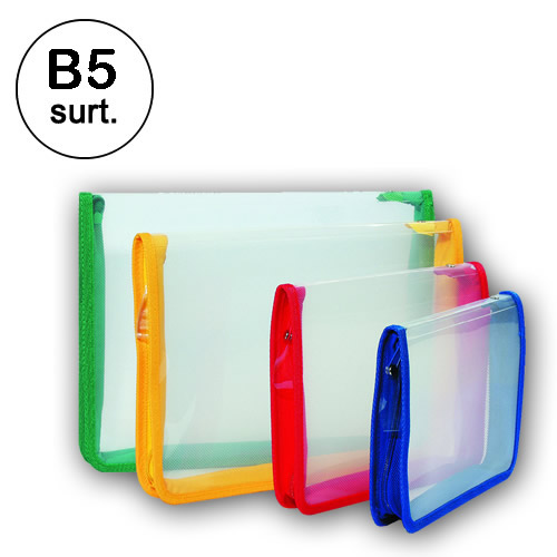 Carpeta B5 en polipropileno de 500 micras rayado con cremallera y ribete surtidos. Azul, rojo, verde y amarillo. (Sustituye a la ref. 9262) Medidas 245x200x10 mm. Capacidad 150 hojas de 80 gramos aprox.