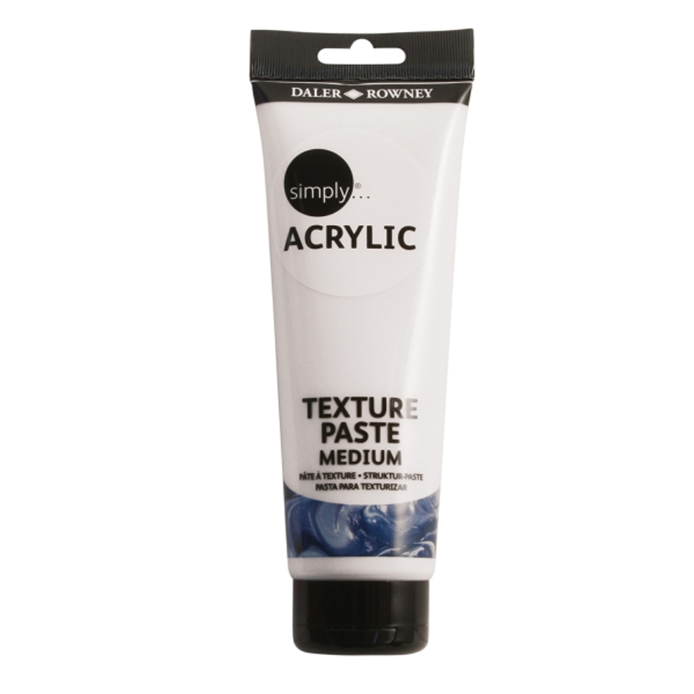 Daler-Rowney Simply Acrylic Texture Medium. Construye capas de textura pesadas en obras de arte y manualidades. Aplicar con un cuchillito, una espátula o un pincel grueso sobre cualquier superficie rígida sin grasa adecuada para pintura acrílica o dar forma con herramientas de odelado. Los tiempos de secado variarán según las condiciones.
