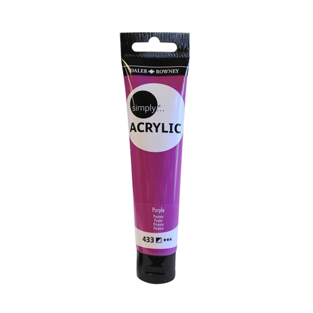 Tubo 75ml Daler-Rowney Simply Lila. Los acrílicos Simply son colores de base agua que se pueden utilizar en todas las superficies artísticas convencionales, como papel, cartón y lienzo. Estos colores de cuerpo suave se pueden usar directamente del tubo, diluidos con agua o mezclados para crear una variedad infinita de colores vibrantes.