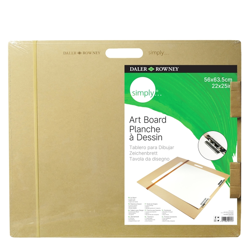 El tablero de arte de madera Simply de Daler-Rowney contiene 2 clips y una banda de goma para sujetar de forma segura hojas grandes de papel y blocs a la mesa de trabajo.