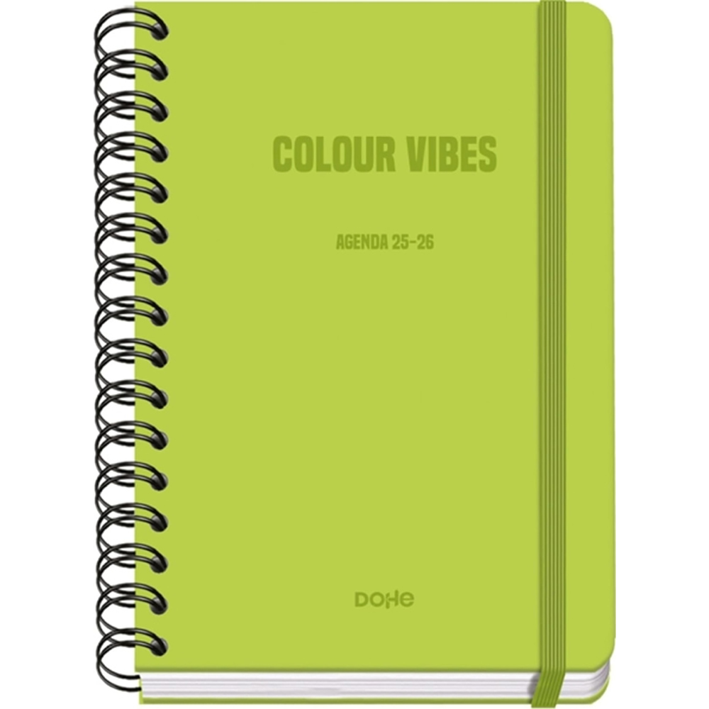 Dohe Colour Vibes Agenda escolar semana vista. Todos los días de la semana en dos hojas. La cubierta está fabricada en cartón forrado con papel impreso a todo color y plastificado mate con puntas redondeadas. Guardas impresas. Una agenda con wire??o metálico de color negro y cierre con goma elástica plana en color verde lima.
