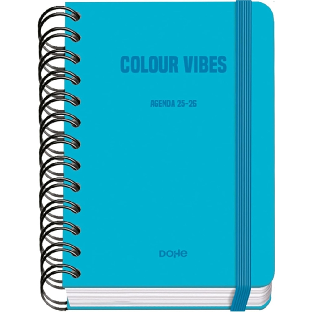 Dohe Colour Vibes Agenda Escolar 25/26 Espiral Wire”™o A6 - Dia Pagina - Papel 80g/m2 - 4 Hojas de Pegatinas - Cubierta de Carton Plastificado - Cierre con Goma Elastica - Color Azul Cyan.