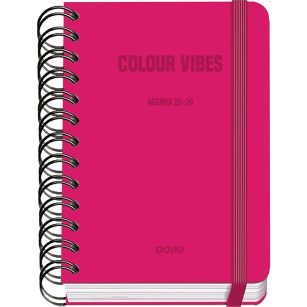 Dohe Colour Vibes Agenda escolar dia pagina. Todos los días de la semana ocupan un página excepto sábado y domingo que comparten hoja. La cubierta está fabricada en cartón forrado con papel impreso a todo color y plastificado mate con puntas redondeadas. Guardas impresas. Una agenda con wire??o metálico de color negro y cierre con goma elástica plana en color rosa.