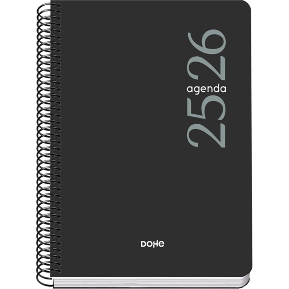 Dohe Esencial Agenda escolar dia pagina. Todos los días de la semana ocupan un página excepto sábado y domingo que comparten hoja. La cubierta está fabricada en polipropileno a todo color con puntas redondeadas. Espiral simple metalico.