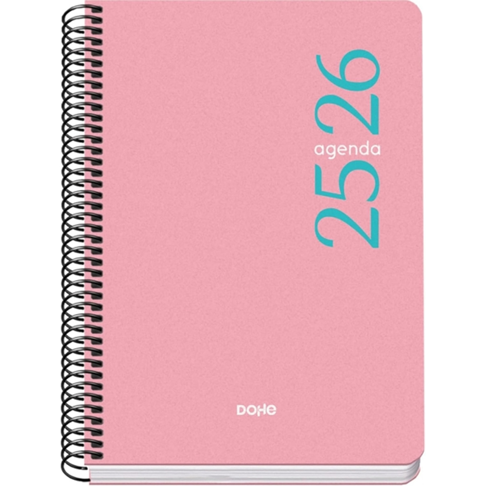 Dohe Esencial Agenda escolar dia pagina. Todos los días de la semana ocupan un página excepto sábado y domingo que comparten hoja. La cubierta está fabricada en polipropileno a todo color con puntas redondeadas. Espiral simple metalico.