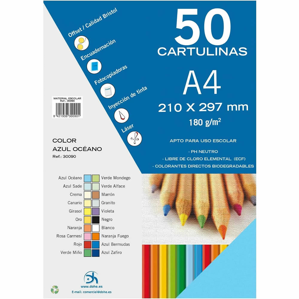 Las cartulinas DOHE son el aliado perfecto para todo tipo de creatividades y manualidades. Una compra para complementar tu material escolar o de oficina. Hemos cuidado al máximo su proceso de fabricación para hacerlas altamente resistentes. Hechas con materiales de primera calidad, son aptas para soportar incluso los proyectos más ambiciosos. Pinta, escribe, dibuja, corta... ¡E incluso imprime y encuaderna con ellas! Múltiples usos para múltiples necesidades.