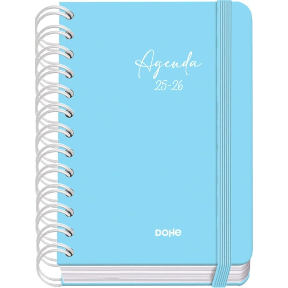 Dohe Serenity Agenda escolar dia pagina. Todos los días de la semana ocupan un página excepto sábado y domingo que comparten hoja. La cubierta está fabricada en cartón forrado con papel impreso a todo color y plastificado mate con puntas redondeadas. Guardas impresas. Una agenda con wire??o metálico de color blanco y cierre con goma elástica plana en color azul.