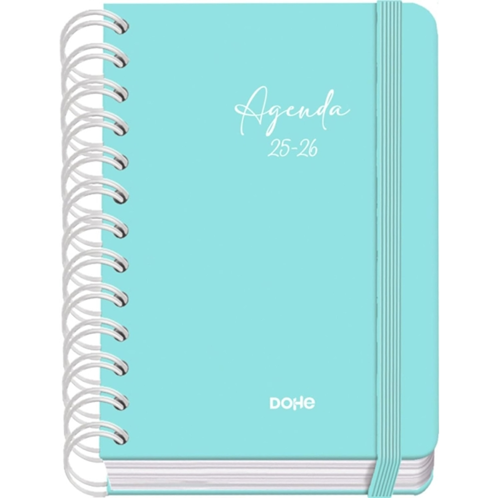 Dohe Serenity Agenda escolar dia pagina. Todos los días de la semana ocupan un página excepto sábado y domingo que comparten hoja. La cubierta está fabricada en cartón forrado con papel impreso a todo color y plastificado mate con puntas redondeadas. Guardas impresas. Una agenda con wire??o metálico de color blanco y cierre con goma elástica plana en color verde.