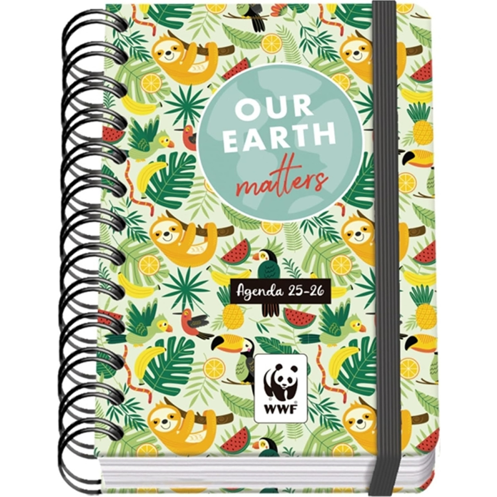 Dohe WWF Tropic Agenda escolar dia pagina. Todos los días de la semana ocupan un página excepto sábado y domingo que comparten hoja. La cubierta está fabricada en cartón forrado con papel impreso a todo color y plastificado brillo con puntas redondeadas. Guardas impresas. Una agenda con wire??o metálico de color negro y cierre con goma elástica plana en color gris.