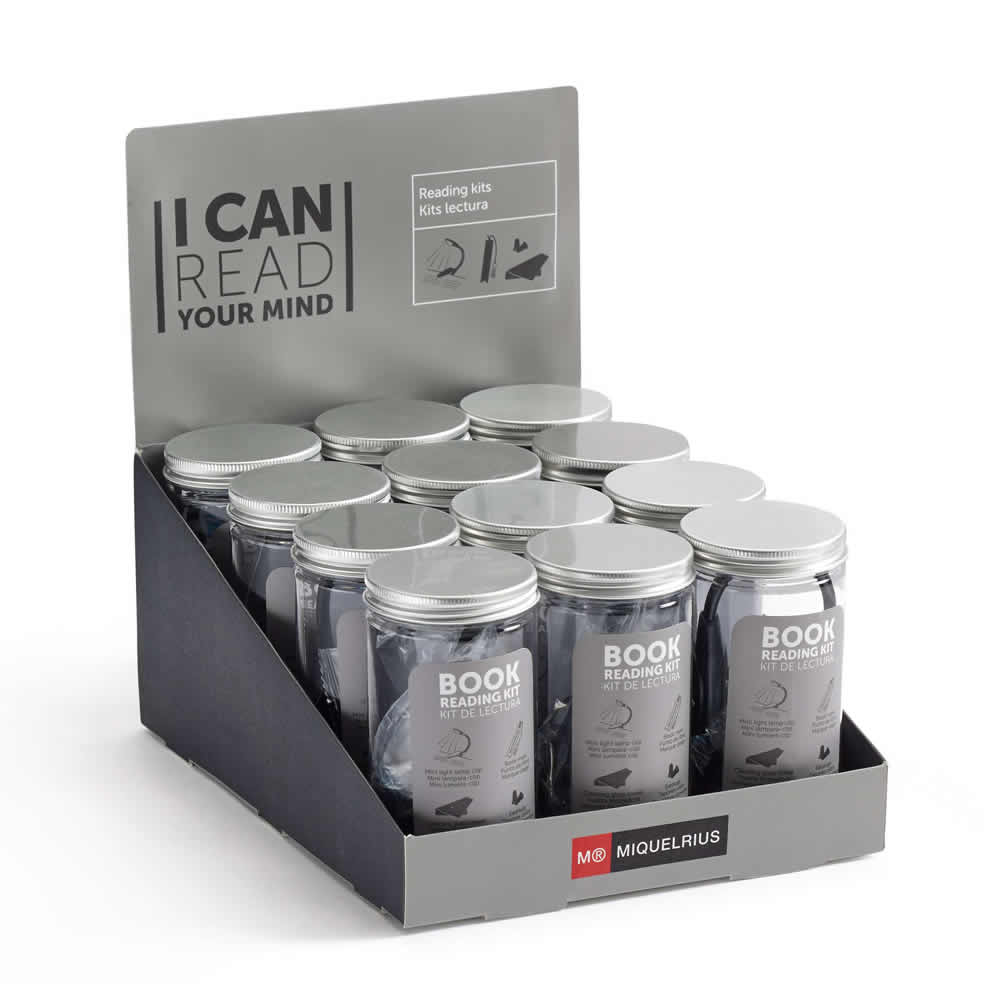 Expositor kits de lectura. Contiene 12 uds del mismo diseño. Práctico kit de lectura para llevar a todas partes que incluye: mini luz de lectura con pinza para colocar en libro o cuaderno, gamuza, tapones y punto de libro. Presentación: Cajita decorada con rosca.