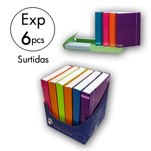 Expositor de 6 cajas de proyectos con goma lomo de 4 cm. Serie Classic Stripe. Surtidas en 5 colores vivos. Medidas 320x240x40 mm. Tambien tenemos las carpetas con anillas a juego. Buscar en la categoria Carpetas con Anillas, seccion Forradas colores Nuevos.