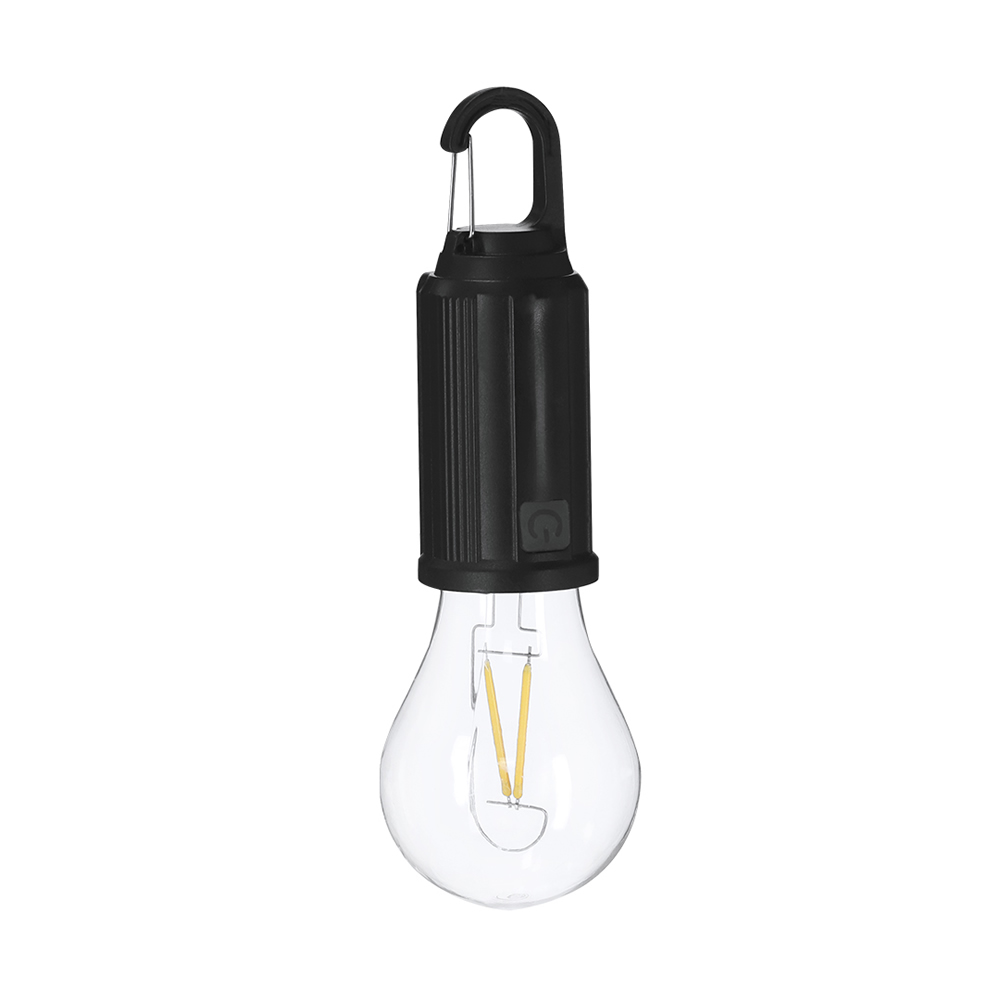 Lampara con original diseño de bombilla con cuerpo en ABS. Batería de 300 mAh y carga solar. Dispone de sensor nocturno que se activa automáticamente al no recibir luz solar. Dispone de carga a través de cable Tipo C, además de incluir mosquetón para fácil transporte. Carga Solar. Sensor Nocturno. Batería 300 mAh.