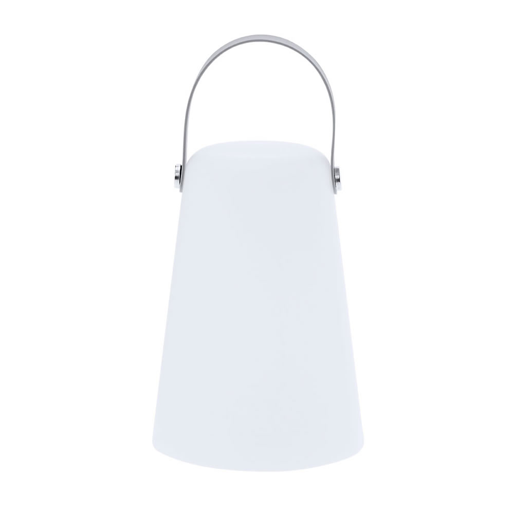 Lámpara en PE de color blanco. Incluye asa superior de suave silicona en tono gris, que facilita su transporte y añade un toque moderno al diseño. Equipada con 4 LEDs , proporciona una luz uniforme y eficiente, tanto para interiores como exteriores. Funciona con 3 pilas AA (no incluidas). Dispone de botón de encendido/apagado. 4 Ledes. 3 Pilas AA No Incluidas.