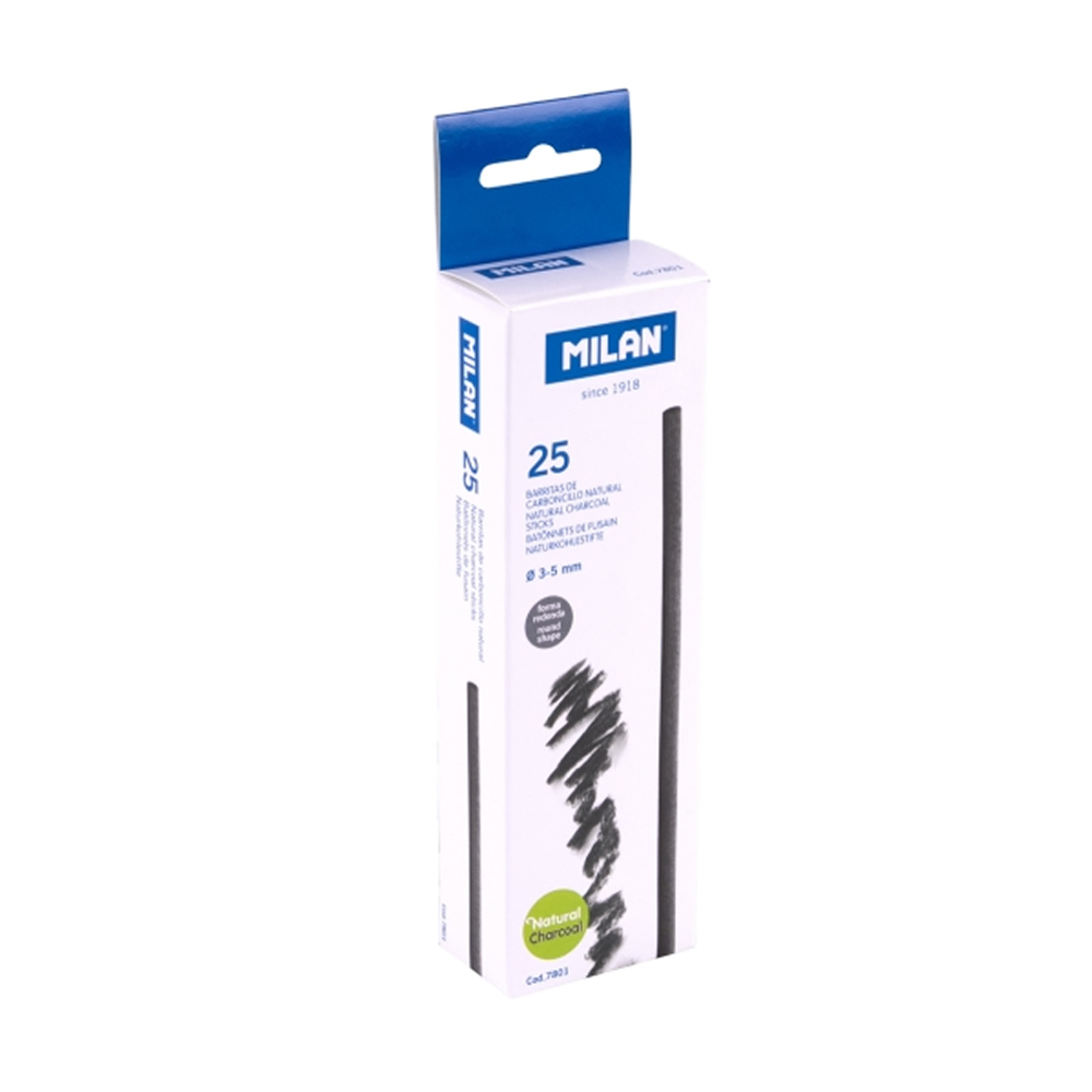 Caja con 25 barritas de carboncillo natural de la marca Milan.