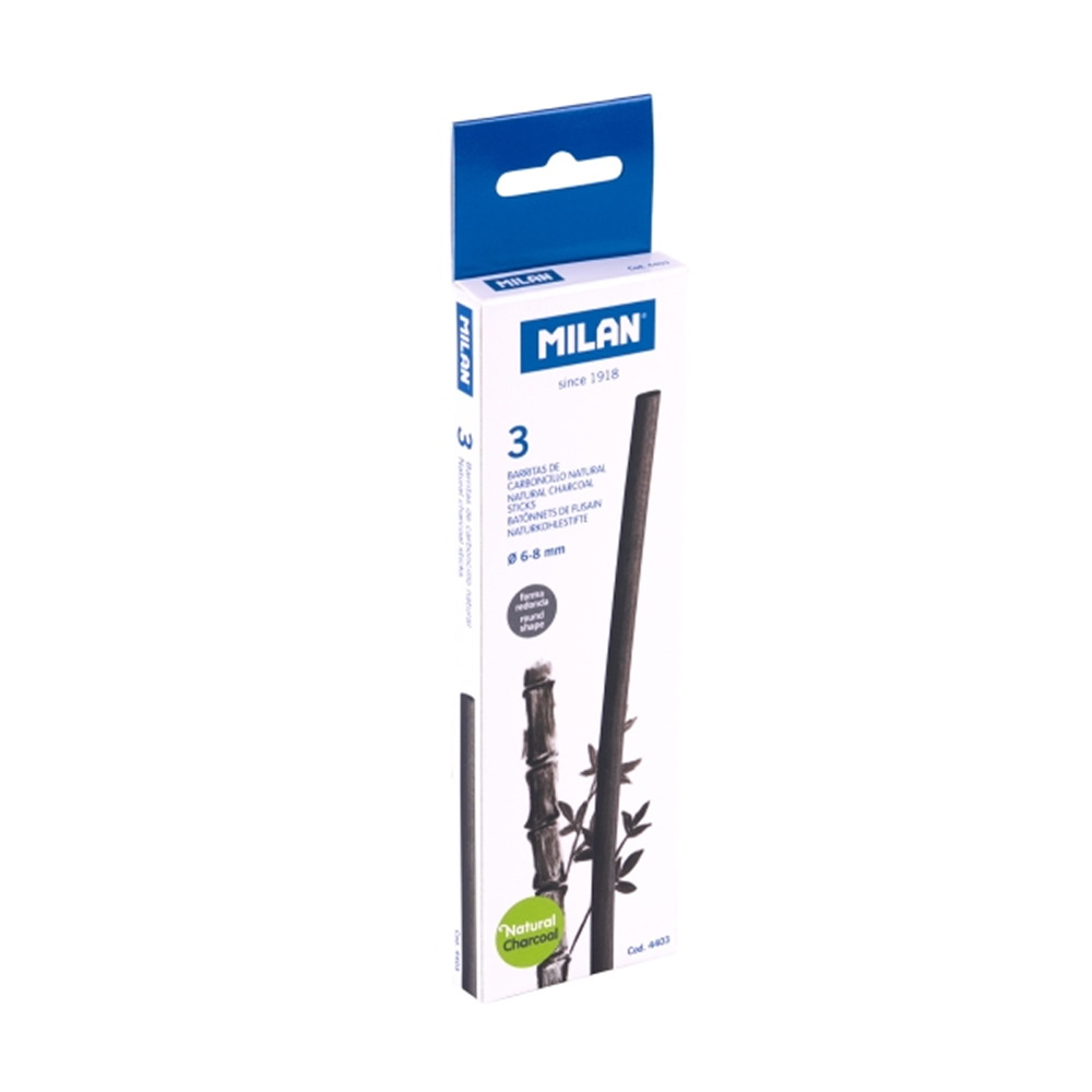 Caja con 3 barritas de carboncillo natural cilíndrico de la marca Milan.