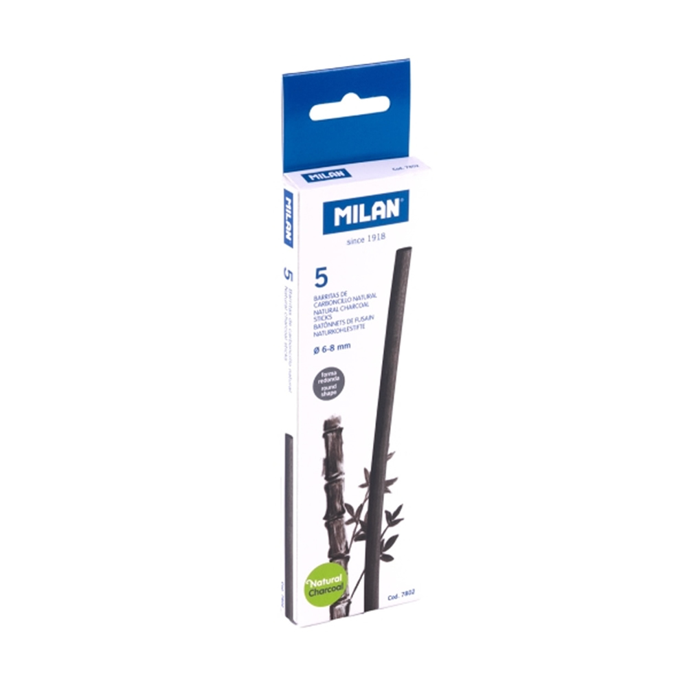 Caja con 5 barritas de carboncillo natural cilíndrico de la marca Milan.