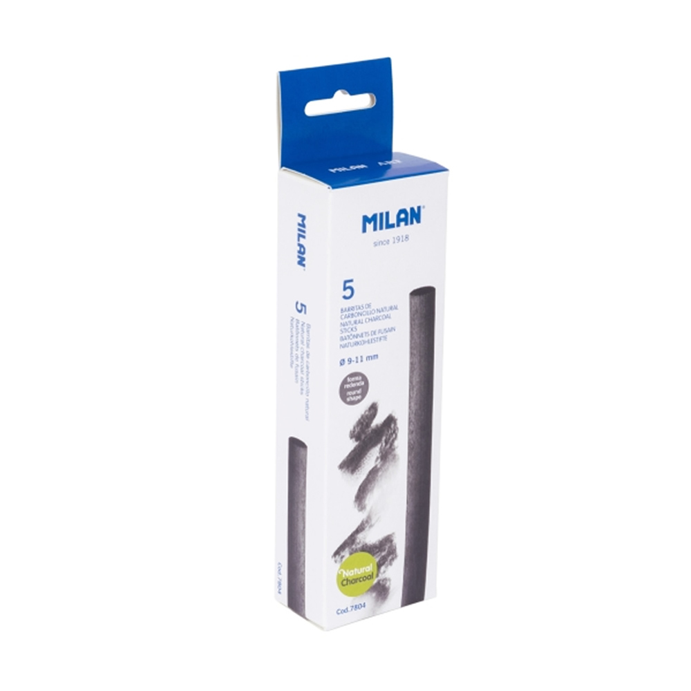 Caja con 5 barritas de carboncillo natural cilíndrico de la marca Milan.