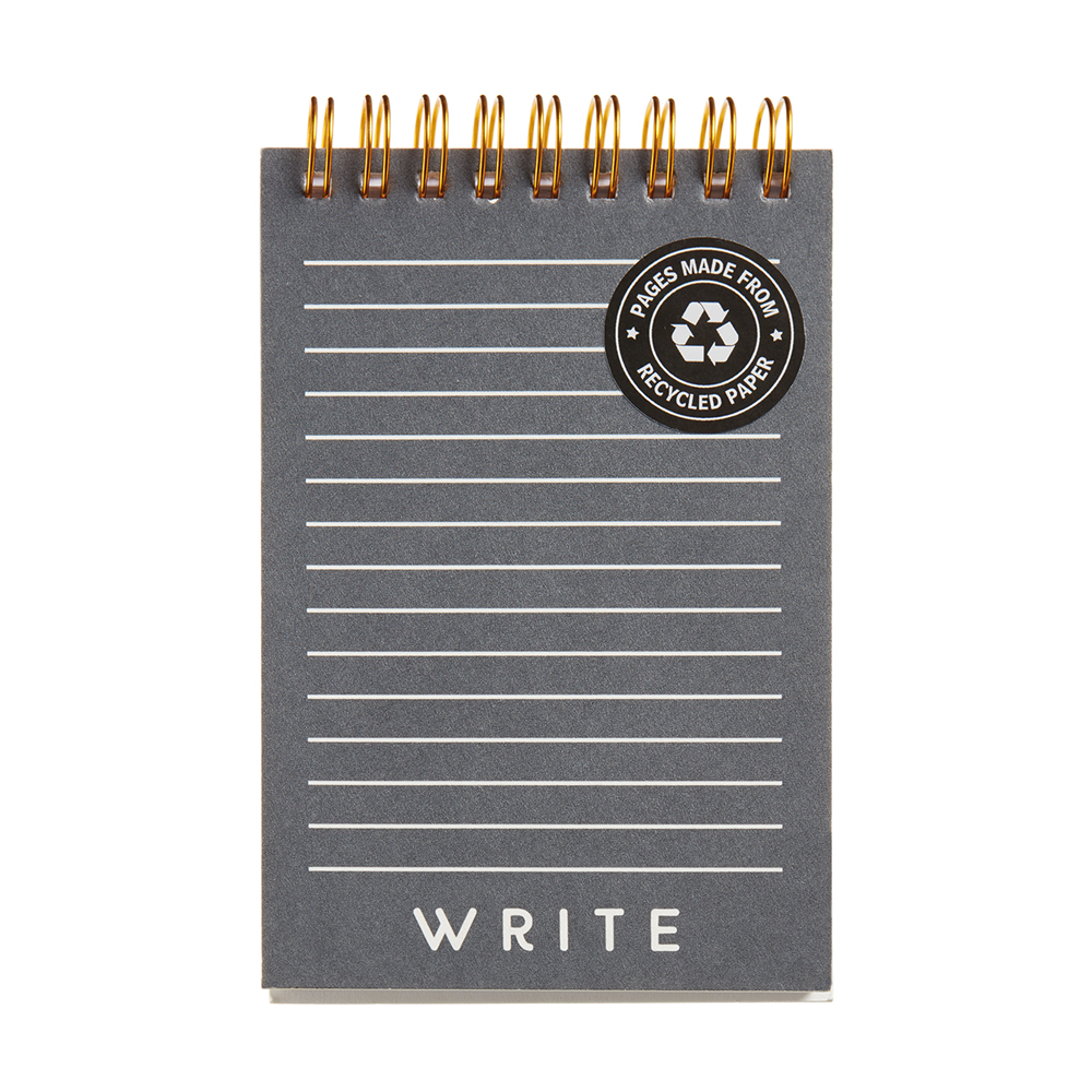 Bloc espiral Miquelrius. Cubiertas: Cartoncillo impreso. Espiral doble en color cobre. Guardas lisas blancas. Tamaño: 129 x 85 mm. Rayado: Horizontal. Hojas: 80 hojas. Papel: Reciclado de 70 g/m².