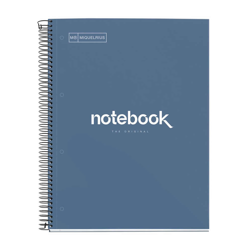 Cuaderno Emotions Miquelrius, tamaño A4 (210 x 297 mm). Cubiertas: Cartón forrado de papel impreso con plastificado brillante, compacto y resistente. Espiral: Metálica continua que permite la apertura en plano del cuaderno, además de dar la vuelta completa, y con cierre coilock que evita enganches. Papel interior: extra opaco de 90 g/m², evita que la tinta traspase y seca rápidamente. Hojas: 160 hojas con 8 bandas de color en el lateral (20 hojas por color), ideales para poder clasificar apuntes y usar un color para cada asignatura; cabecera para títulos; microperforado para un arranque limpio y 2 Taladros: para archivar. Rayado: Cuadrícula 5mm.