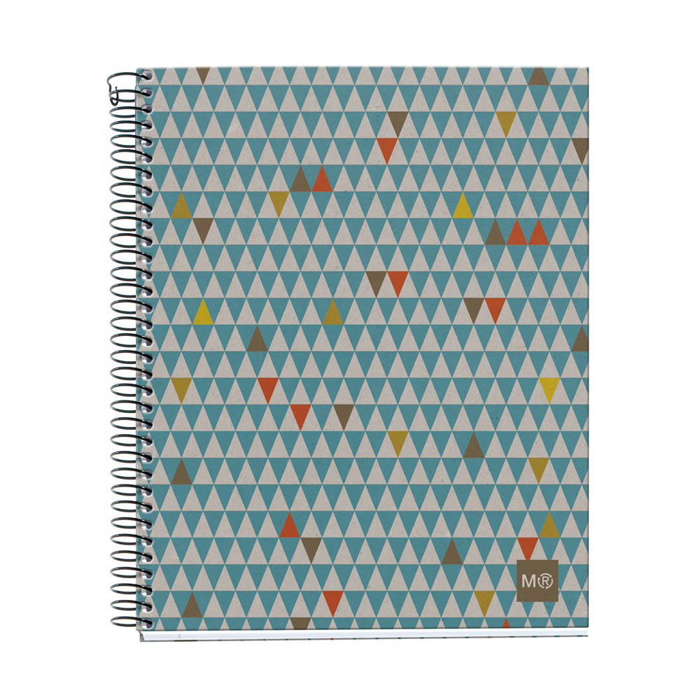 Notebook Nb4 A5 120 Hor 80G Ecotriangles Mr. Cuaderno reciclado Miquelrius, tamaño A5 (148 x 210 mm). Cubiertas: Cartón 100% reciclado (recuperdado post-consumo), compacto y resistente. Espiral: Metálica, con recubriemiento ecológico, que permite la apertura en plano del cuaderno, además de dar la vuelta completa, y con cierre coilock que evita enganches. Papel interior: 100% reciclado (recuperado post-consumo) de 80 g/m², evita que la tinta traspase y seca rápidamente. Hojas: 120 hojas con banda de color en el lateral, ideales para poder clasificar apuntes y usar un color para cada asignatura; cabecera para títulos; microperforado para un arranque limpio y 2 taladros para archivar. Rayado: horizontal 7 mm.