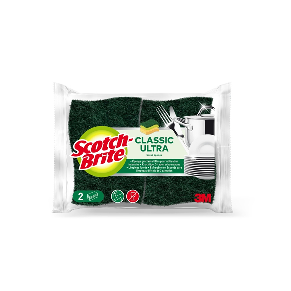El estropajo clásico ultra Scotch-Brite® es un estropajo duradero y eficaz, diseñado para desincrustar la grasa, los restos de comida quemados y otras manchas domésticas. Cuenta con una tecnología de triple capa flexible para la limpieza de zonas de difícil acceso.