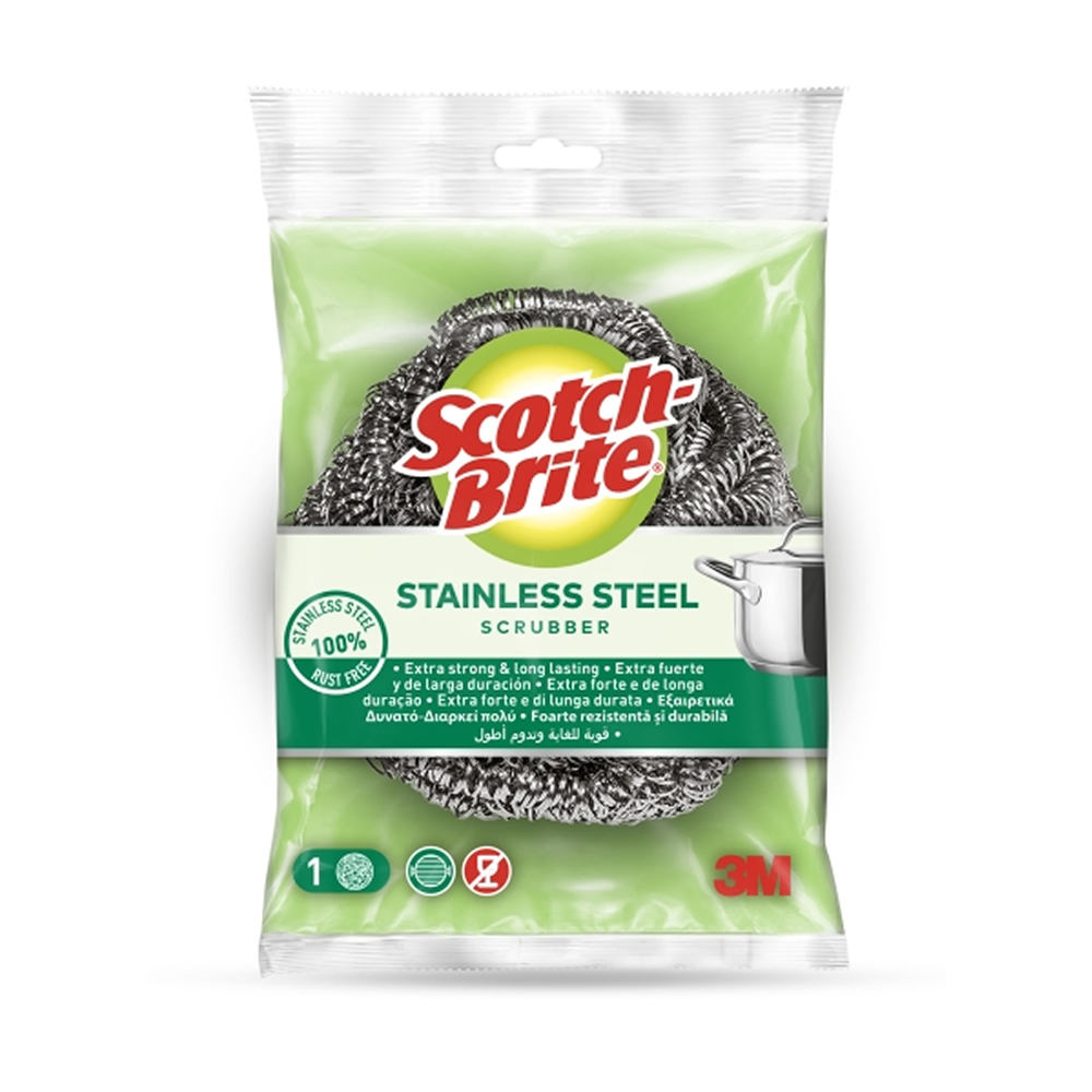 El estropajo de acero inoxidable Scotch-Brite® es un estropajo potente y duradero, diseñado para eliminar grasa, alimentos quemados y otras manchas domésticas.