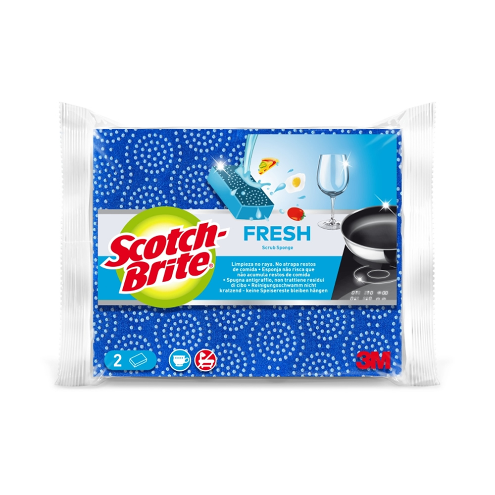 El estropajo no raya Scotch-Brite® Fresh ahora incorpora los novedosos puntos abrasivos de Scotch-Brite®, que ayudan a limpiar la vajilla sin que quede comida atrapada en el estropajo. La forma especial de esta esponja protege las uñas durante las tareas de limpieza más exigentes
