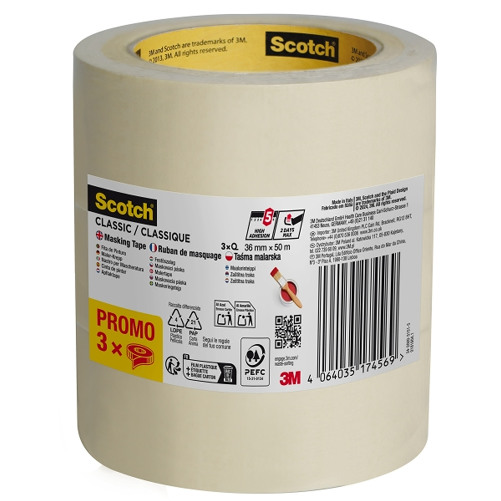 La cinta de enmascarar Scotch® Classic es una cinta de enmascarar beige para uso en superficies que no se dañen, sin dejar residuos si se retira hasta 2 días después de su aplicación.