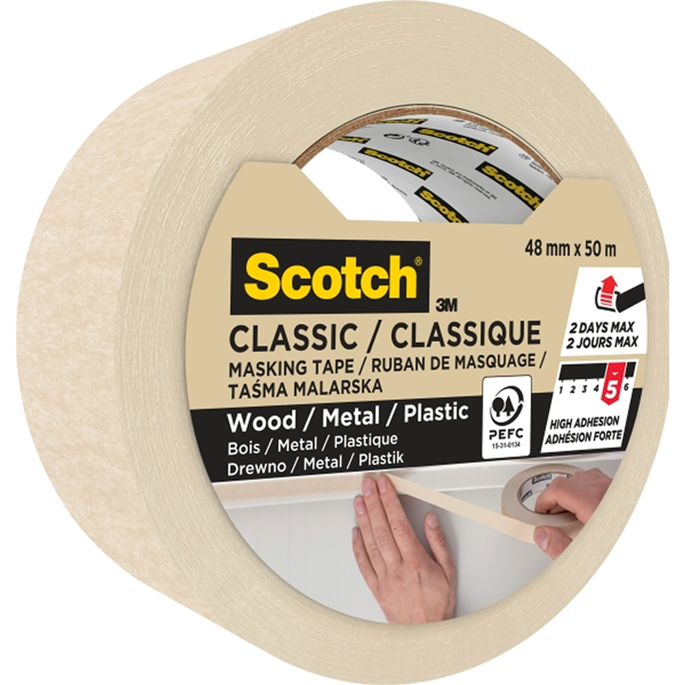 La cinta de enmascarar Scotch® Classic es una cinta de enmascarar beige para uso en superficies que no se dañen, sin dejar residuos si se retira hasta 2 días después de su aplicación.