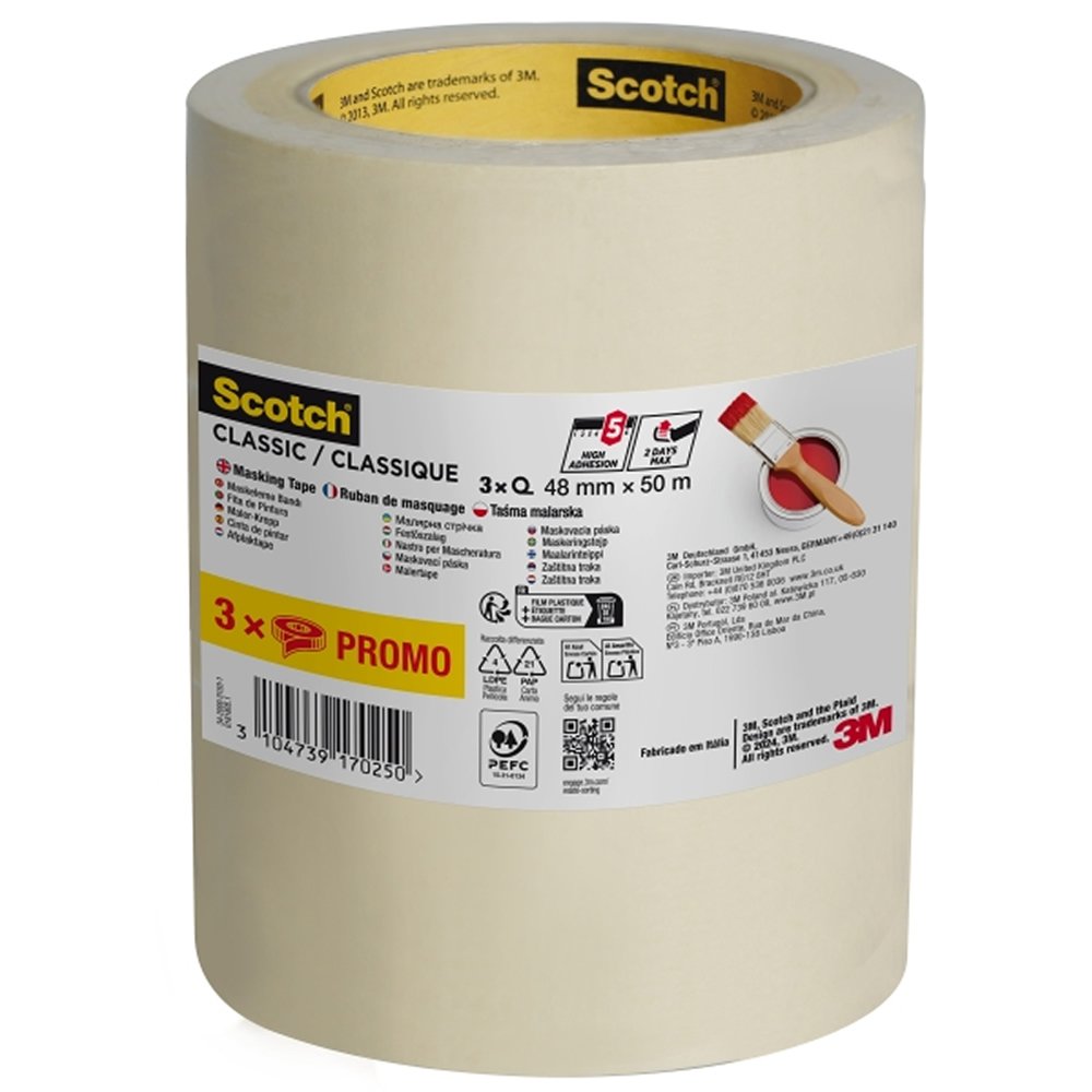 La cinta de enmascarar Scotch® Classic es una cinta de enmascarar beige para uso en superficies que no se dañen, sin dejar residuos si se retira hasta 2 días después de su aplicación.